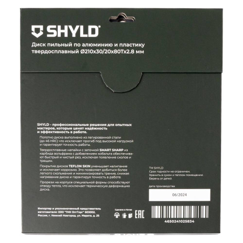 Диск пильный по алюминию и пластику SHYLD твердосплавный 210х30/20 мм, 80 зубьев(20660)