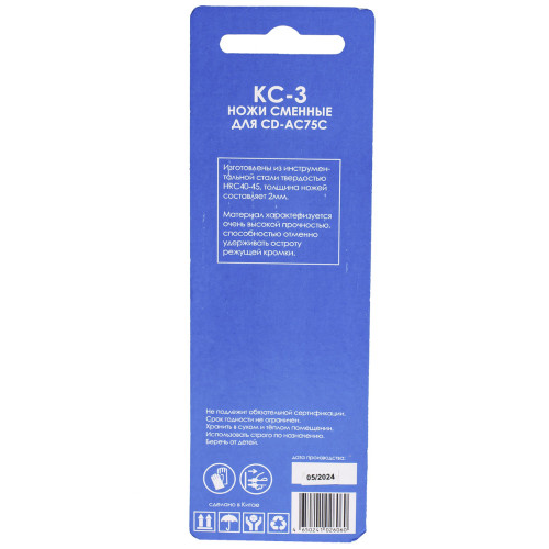 Артикул товара: KC-3 Штрихкод: 4650241026060 Характеристики товара: Страна производства - Китай. Вес товара, г - 500.0000. Толщина, мм - 2. Габариты упаковки, мм - 150х50х30..